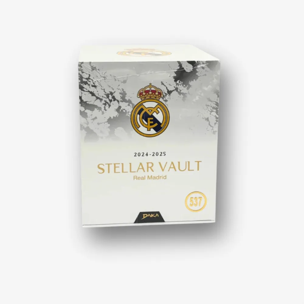 DAKA 2024-25 Real Madrid Stellar Vault Hobby Box to prawdziwy produkt klasy high-end. Główny nacisk położono na karty ocenione (graded) przez CGC oraz wysokiej jakości autografy, dzięki czemu box wyraźnie wyróżnia się na tle klasycznych formatów Hobby.
