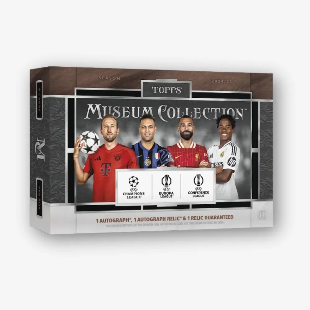 Topps Museum Collection UEFA Club Competitions 2024/25 przenosi artyzm pięknej gry do jednej z najbardziej prestiżowych marek Toppsa. Znana z autografów podpisywanych bezpośrednio na kartach, reliców używanych w meczach oraz eleganckiego designu w czerni, srebrze i złocie, seria Museum oferuje dopracowaną checklistę pełną gwiazd, kart debiutantów oraz efektownych kart auto–relic, stworzonych z myślą o prawdziwych kolekcjonerach.