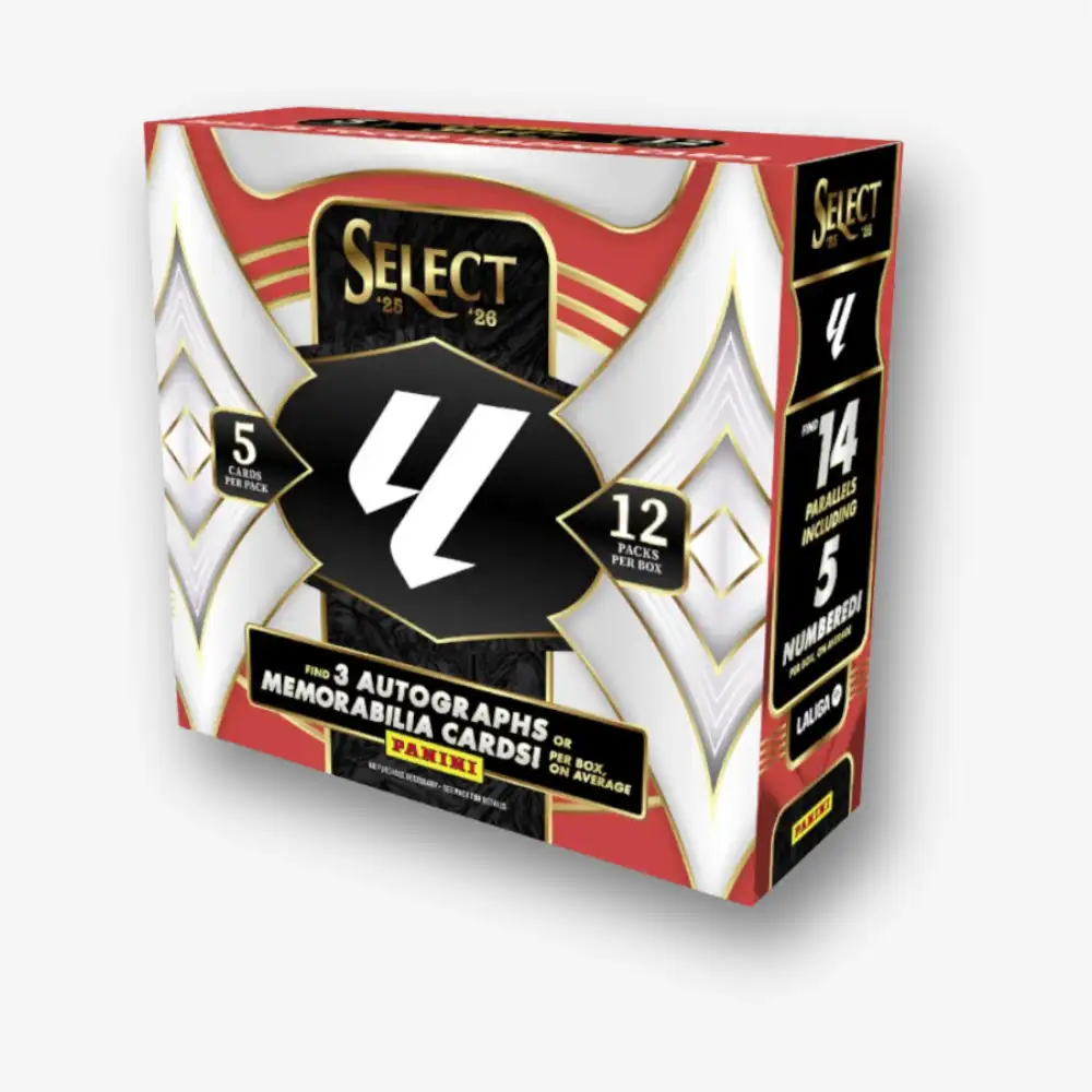 2025-26 Panini Select La Liga Soccer skupia się na najwyższym poziomie hiszpańskiej piłki, oferując charakterystyczną, wielopoziomową checklistę, efektowne wersje „rainbow” paraleli oraz chromowane wykończenie kart.