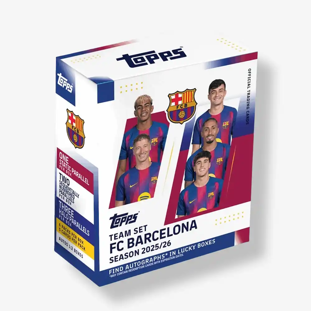 Topps z przyjemnością ogłasza powrót zestawu FC Barcelona Team Set na sezon 2025/26! Poluj na obecne gwiazdy oraz legendy hiszpańskiego mistrza w tej ekscytującej kolekcji.
