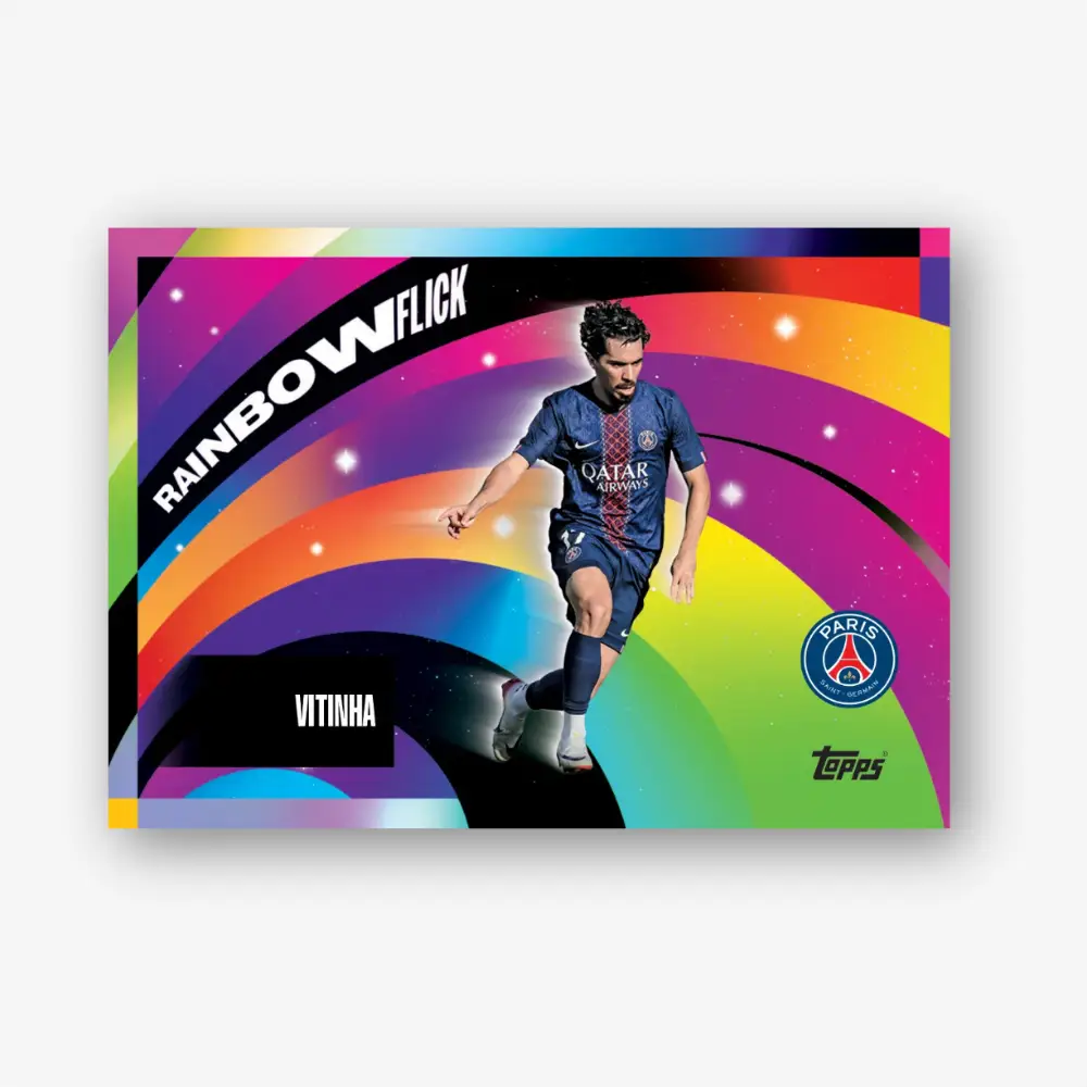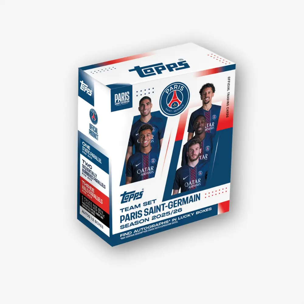 Topps Team Set 2025/26 Paris Saint-Germain to ekskluzywna, klubowa seria celebrująca przeszłość, teraźniejszość i przyszłość PSG. Zawiera inserty Rainbow Flick, obszerną checklistę autografów oraz nową klasę rookie, oferując dużą wartość kolekcjonerską dla fanów Les Parisiens.