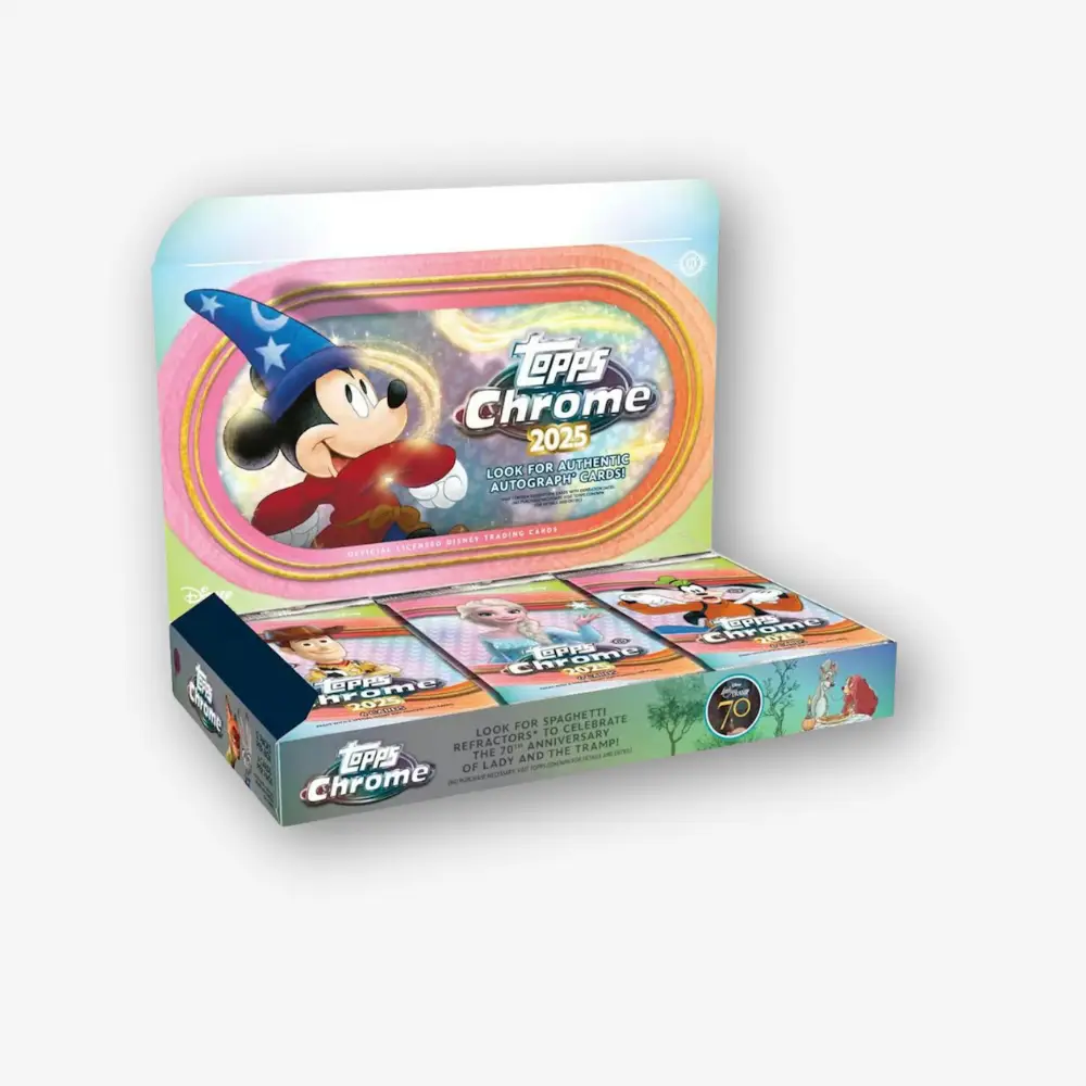 Cud świata Disneya spotyka się z magią Topps w zupełnie nowym zestawie kart kolekcjonerskich Disney Chrome 2025. W tym wydaniu znajdziesz wszystkich swoich ulubieńców w efektownej technologii Chrome, a po raz pierwszy pojawią się także rzadkie, oryginalne karty z autografami największych gwiazd – aktorów i aktorek głosowych z całej epickiej historii Disneya i Pixara.