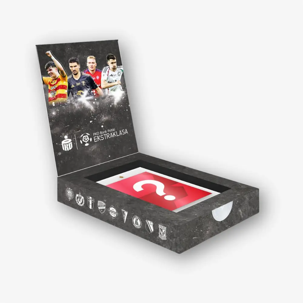 Exclusive box z kartami piłkarskimi PKO BP Ekstraklasa 2025/26 – Seria 1 zawiera 1 kartę Unique Mark, umieszczoną w magnetycznym holderze.