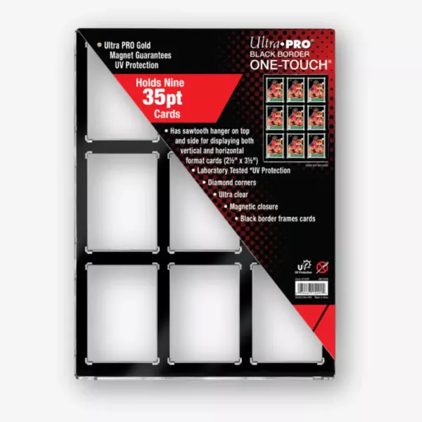 9-kartowy czarny holder ONE-TOUCH z elegancką czarną ramką doskonale eksponuje karty, podkreślając ich wygląd i kolory. To idealne miejsce na Twoje najcenniejsze karty — składa się z dwóch części połączonych wsuwanym zawiasem i zamknięciem magnetycznym, dzięki czemu montaż jest szybki i bez użycia narzędzi. Holder zapewnia ochronę przed promieniowaniem UV, jest wolny od PVC i kwasów, co gwarantuje zachowanie kart w idealnym stanie. Doskonale nadaje się do prezentacji wyjątkowych i rzadkich kart kolekcjonerskich oraz kart do gier. Posiada uchwyty typu „ząbkowany wieszak” zarówno u góry, jak i z boku, co umożliwia ekspozycję w pionie lub w poziomie. Ten model mieści dziewięć standardowych kart (2,5″ x 3,5″) o grubości do 35 pt.
