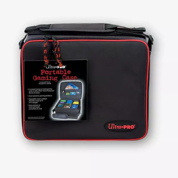 Torba na ramię z regulowanym paskiem i przegrodami, zaprojektowana do przechowywania kart kolekcjonerskich w koszulkach Ultra PRO Deck Protector, pudełek na karty oraz innych akcesoriów do gier.